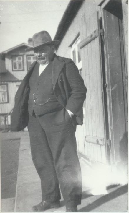 Jóhann kaupmaður við Háeyrarpakkhús, húsið Reginn í baksýn.