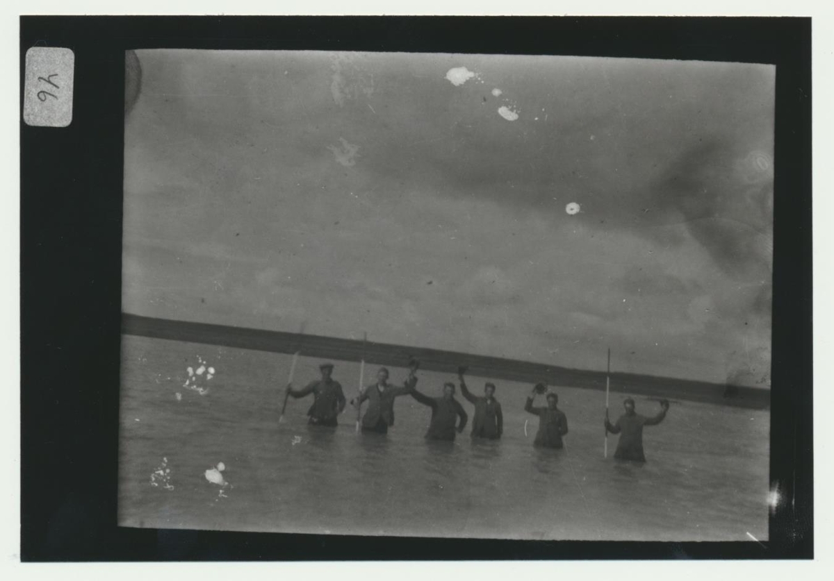 Mynd af sex karlmönnum með stikur í hendi úti í vatni.