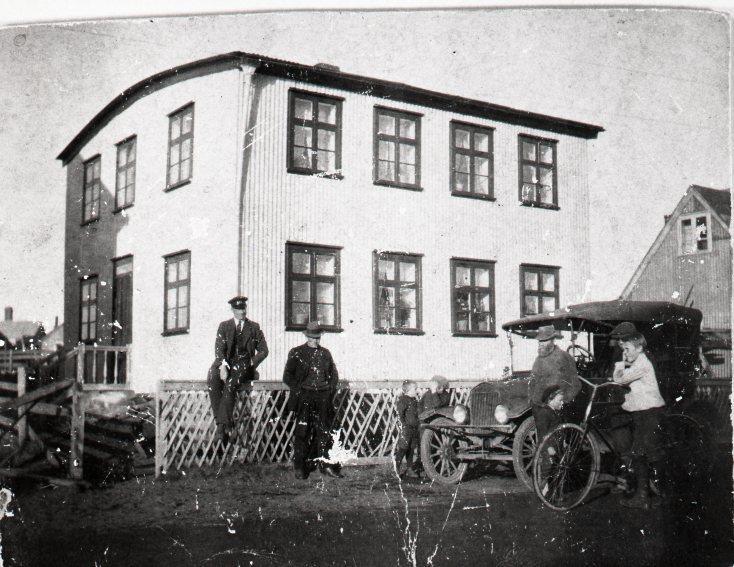 Steingrímur situr á grindverki framan við húsið. Þetta er Kristjánshús, Búðarstígur 10, á Eyrarbakka og húsið hægra megin er Gróubær, vinstramegin er Inghóll.
