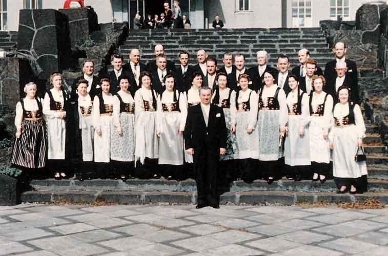 fyrir framan uppstiltan Dómkirkujkór á tröppum. Konur klæddar upphlut.
