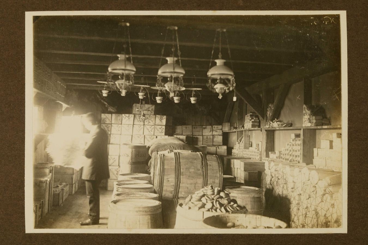 Mynd úr safni Oline Lefolii kaupmannsfrúar á Eyrarbakka. Tekið á vörulager Lefoliiverslunar eða Einarshafnar. Níels Ísaksson að störfum.