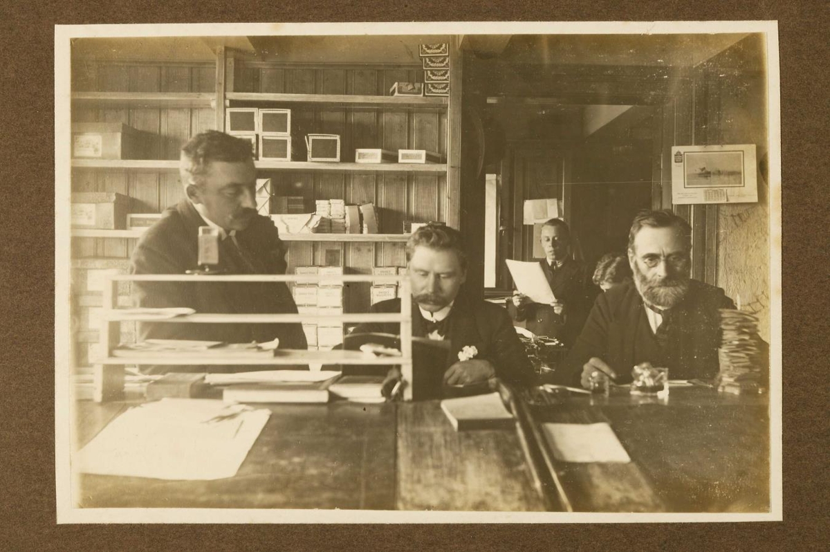 Mynd úr safni Oline Lefolii kaupmannsfrúar á Eyrarbakka. Tekið af karlmönnunum í Einarshafnarverslun á Eyrarbakka. Lengst til vinstri er verslunarstjórinn Jens D. Nielsen, fyrir miðju situr Guðmundur Sigurðsson, af blaði les Berentzen assistent og lengst til hægri situr Guðmundur Guðmundsson bóksali. Af dagatali lengst til hægri má ætla að ljósmyndin sé tekin 1914.