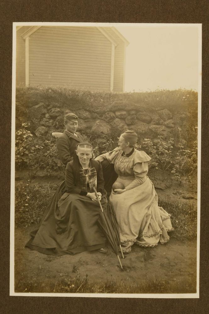 Mynd úr safni Oline Lefolii kaupmannsfrúar á Eyrarbakka. , Guðmundur, Ásta (eða Jörgina) og Eugenía í garðinum hjá Húsinu.