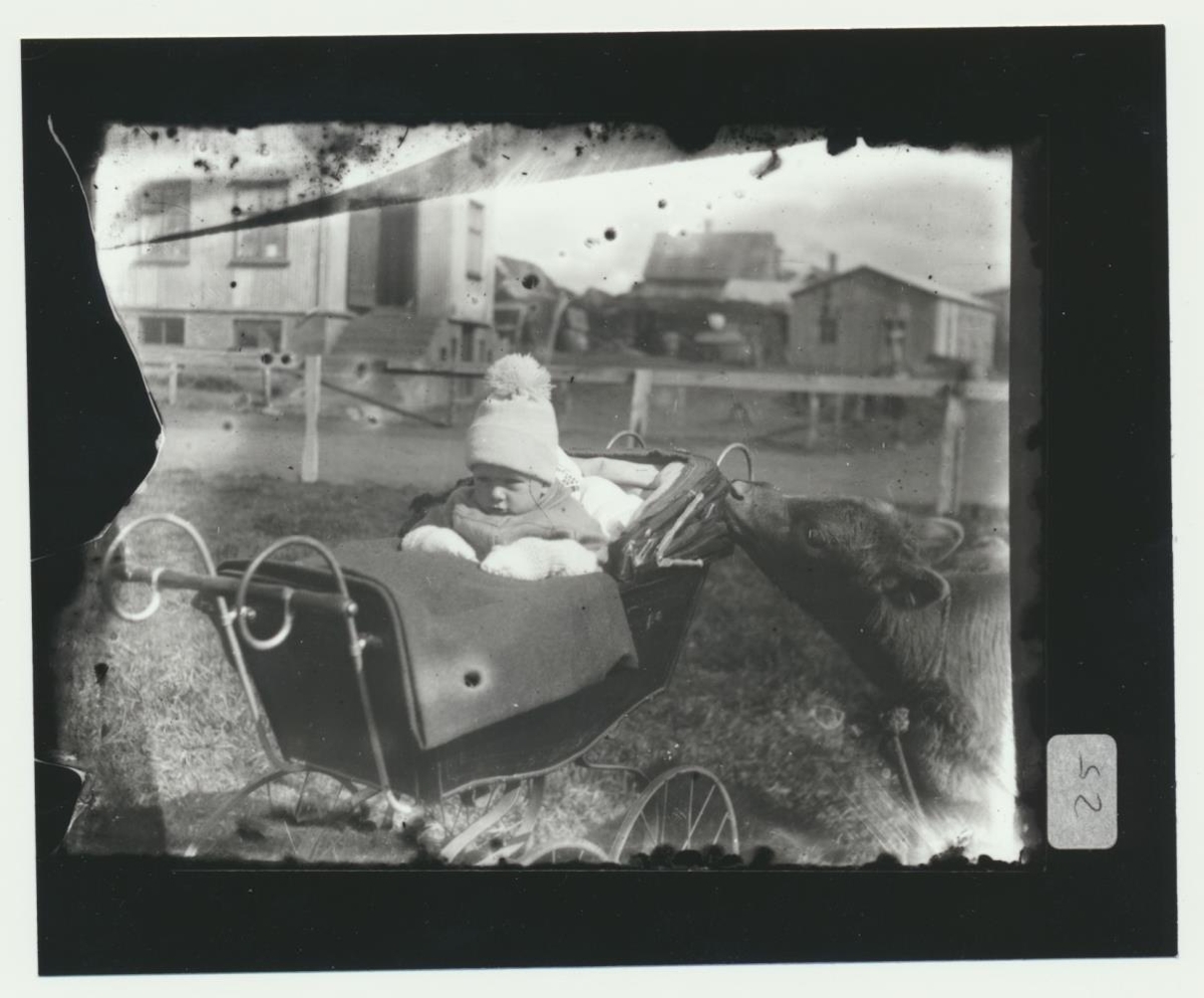 Úr safni Guðmundar Sigurðssonar. Myndin er tekin við Stíghús, af Ingibjörgu í vagni og kálfur í bandi. Tindastóll og í bakgrunni Skúmsstaðir og síðan bílaskúrinn.