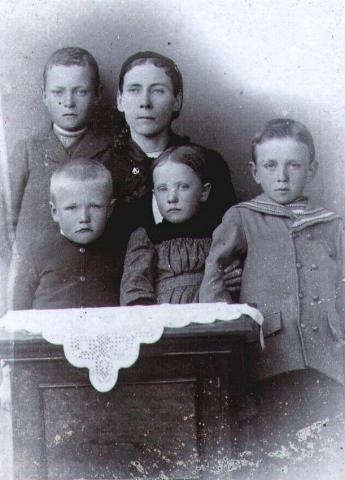 Hólmfríður Brynjólfsdóttir á Kjarlaksstöðum ásamt syni sínum og fósturbörnum.Efri röð frá vinstri mæðginin Hákon Oddsson (1891-1920) og Hólmfríður Brynjólfsdóttir (1964-1915). Neðri röð frá vinstri fósturbörnin Hákon Óskar Jónasson (1897-1983), Agnes Guðfinnsdóttir (1897-1987) og Jósef Haraldsson (1895-1925).