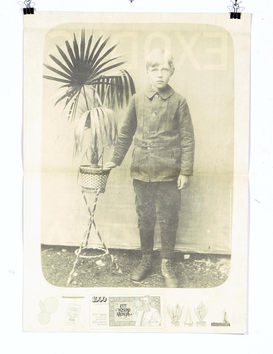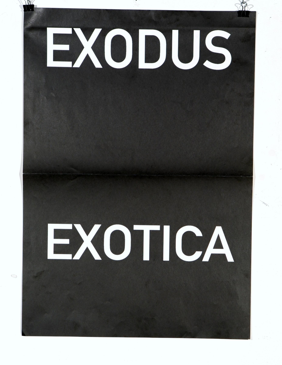 Veggspjald vegna sýningar Ásmundar Ásmundssonar, gert fyrir sýningu í Nýlistasafninu. Prentað er báðum megin á veggspjaldið, öðru megin er ljósmynd og hinum megin er svartur bakgrunnur með hvítum blokkstöfum þar sem stendur Exodus Exotica.