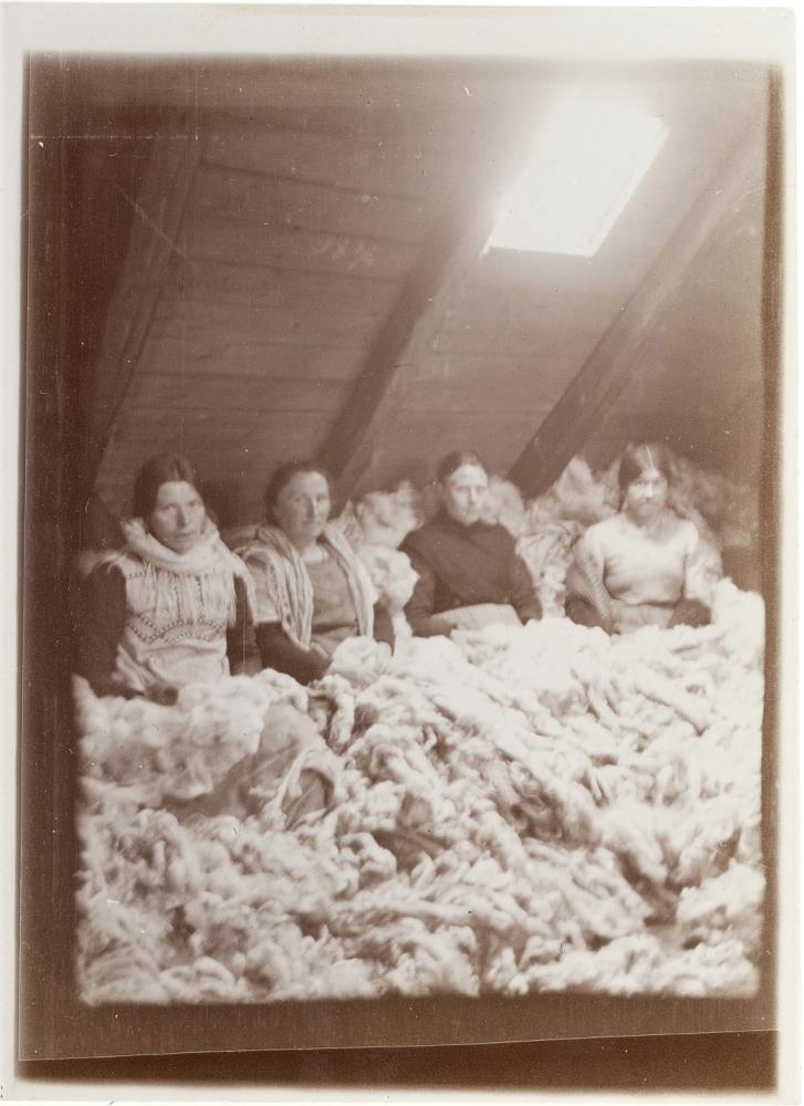 Þorgerður Halldórsdóttir lengst til hægri, móðir Pálínu Pálsdóttur í Hraungerði. Myndin er tekin á ullarloftinu í Vesturbúðinni. Gefandi Sigríður dóttir Haraldar Sigurðssonar frá Kaldaðarnesi í Sandvíkurhreppi.