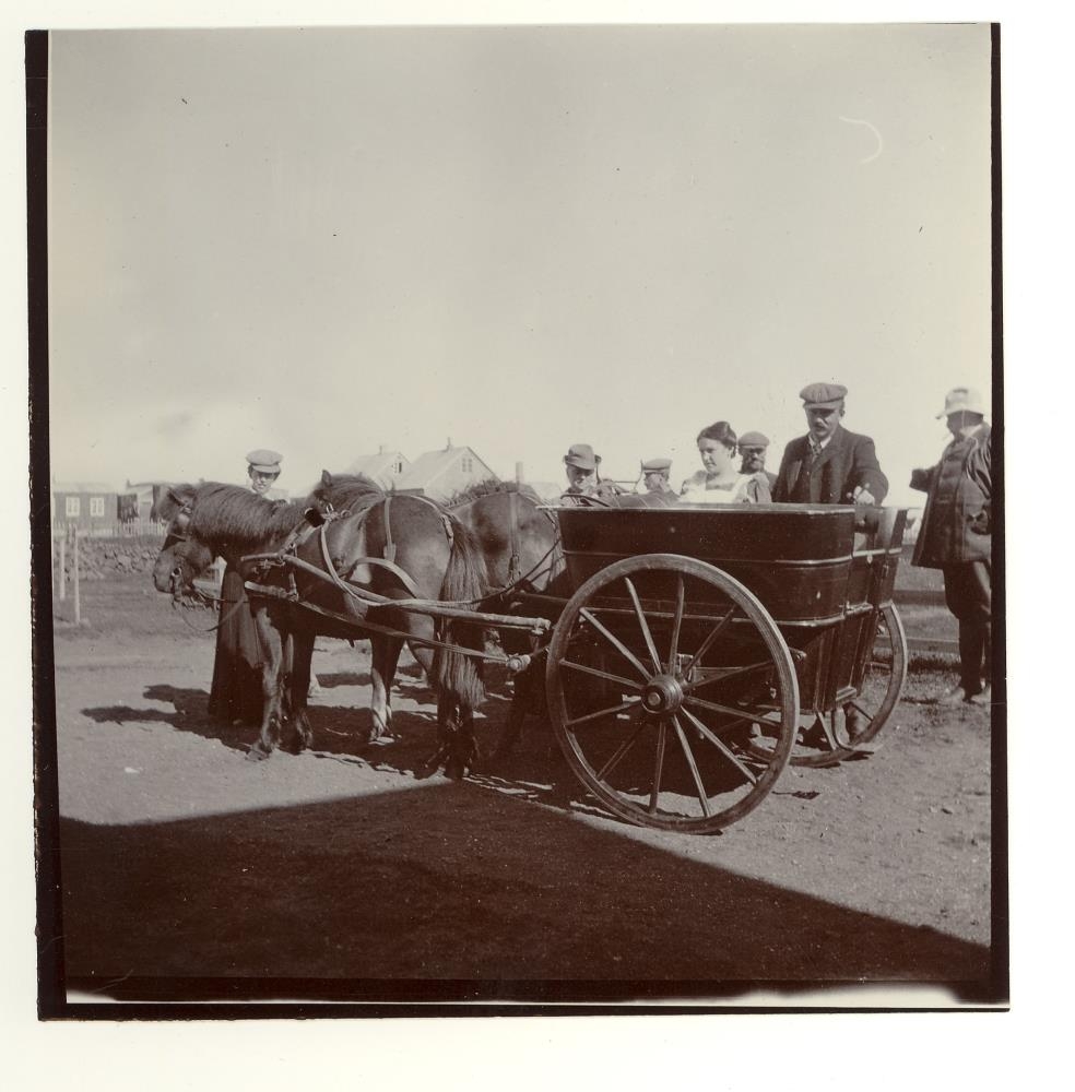 Mynd úr safni Agnesar Lunn, sem hún tók í dvöl sinni á Eyrarbakka. Guðmunda Nielsen, Eugenia Th. Nielsen og hjónin Karen og Jens. D. Nielsen standa við hestvagn.