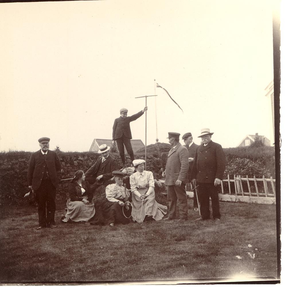 Mynd úr safni Agnesar Lunn, sem hún tók í dvöl sinni á Eyrarbakka. Fólk í garðinum fyrir sunnan Húsið. Í baksýn glittir í hús við aðalgötuna.