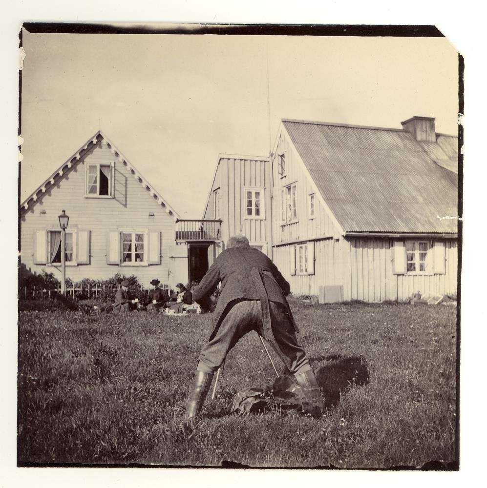 Mynd úr safni Agnesar Lunn, sem hún tók í dvöl sinni á Eyrarbakka. Mynd af Hörring náttúrufræðingi að taka mynd af Húsinu á Eyrarbakka.