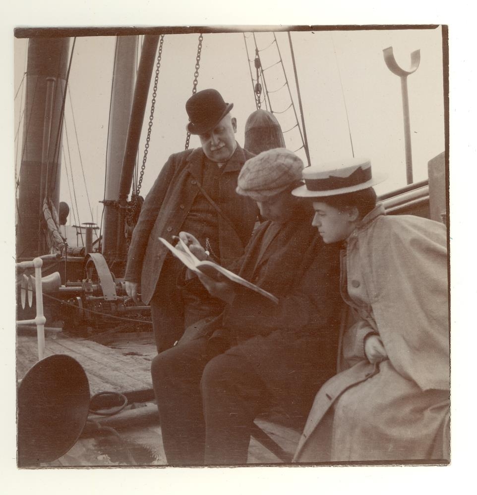 Mynd úr safni Agnesar Lunn, sem hún tók í dvöl sinni á Eyrarbakka. Og á leið sinni til Íslands. Tveir karlmenn og kona um borð í skipi.