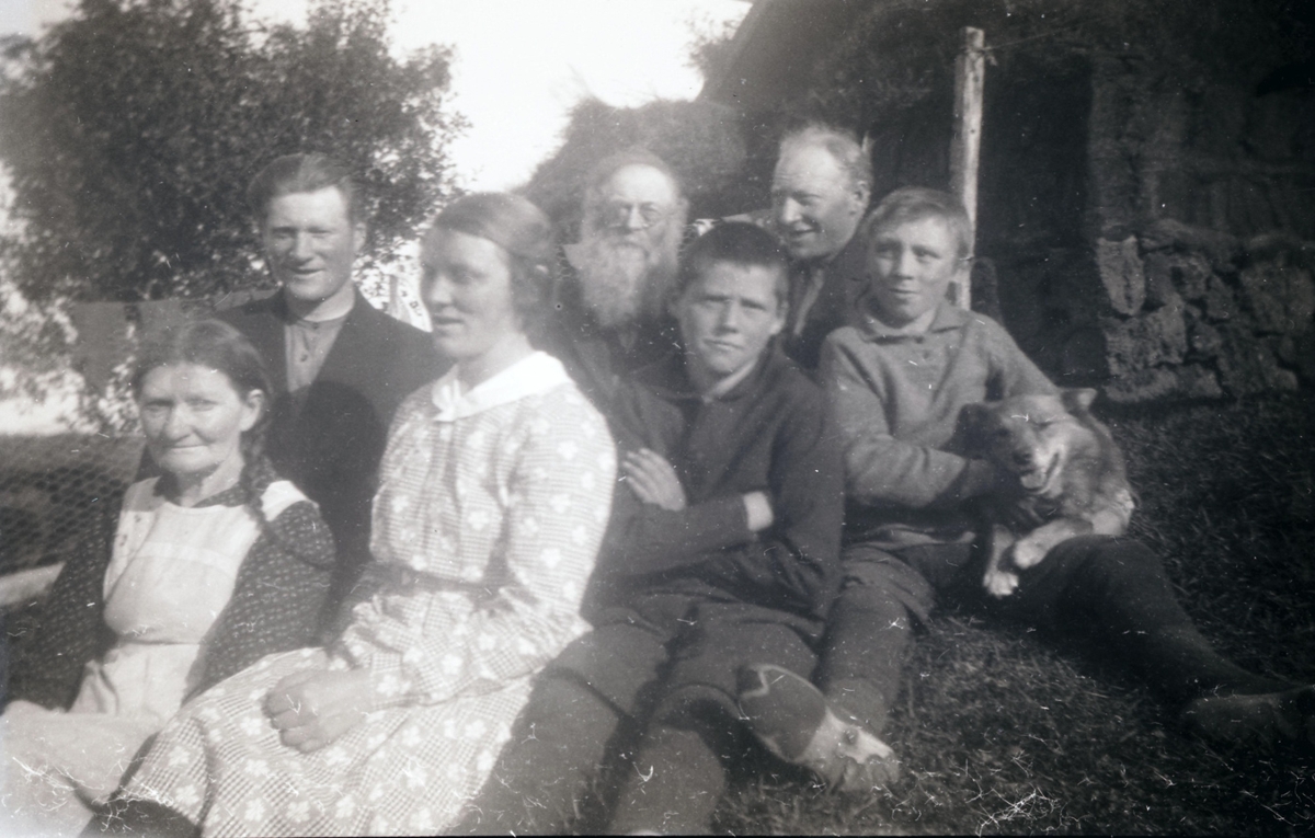Sbr BÁM: 2006-67,BÁM: 2006-69, BÁM: 2006-75 og BÁM: 2006-76. Frá vinstri til hægri 1. röð Hólmfríður Eyjólfsdóttir fædd 1868 og dáin 1958 móðir Þórlaugar, Þuríður Bjarnadóttir fædd 1899 systir Þórlaugar og óþekktur strákur. Önnur röð Eyjólfur Bjarnason fæddur 1906 bróðir Þórlaugar, Bjarni Benediktsson fæddur 06.11.1863 og dáinn 09.03.1947, faðir Þórlaugar, Jón Bjarnason bróðir hennar og óþekktur strákur með hund.
