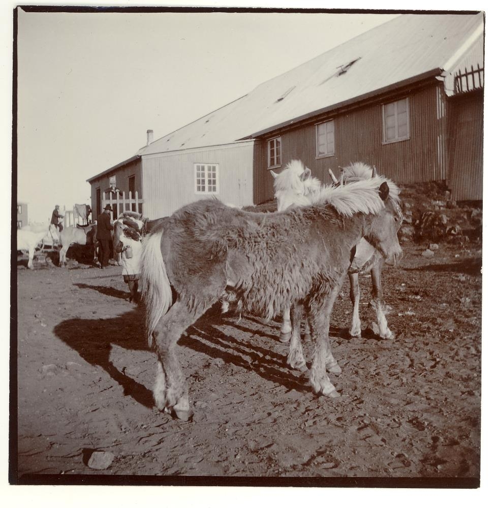 Mynd úr safni Agnesar Lunn, sem hún tók í dvöl sinni á Eyrarbakka. Hross fyrir norðan Vesturbúðina.
