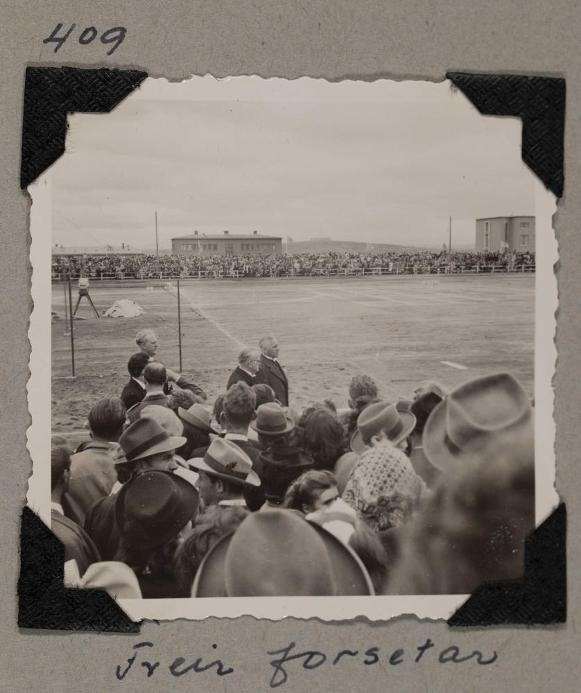 Íþróttamót á Melavellinum, Sveinn Björnsson og Benedikt G. Waage ganga um völlinn. Áhorfendur í forgrunni og í stúkunni handan vallarins. Við myndina er skrifað: 1946. Tveir forsetar.