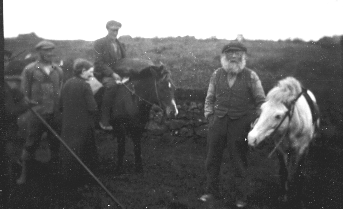 Hellnaselsfólk og hestar. Gamall maður með skegg er Bjarni Benediktsson, f.1863-d.1947. Hann var faðir Þórlaugar Bjarnadóttur, ljósmóður á Eyrarbakka 1926-1966. Sbr: BAM 2006-51, 67, 69, 75, 76, 79.