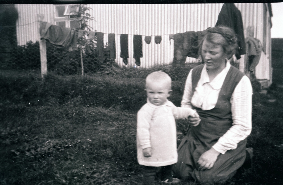 sonur hennar Hjörtur Arnórsson, f.1932. Í baksýn þvottur. Sbr:BAM 2006-48,