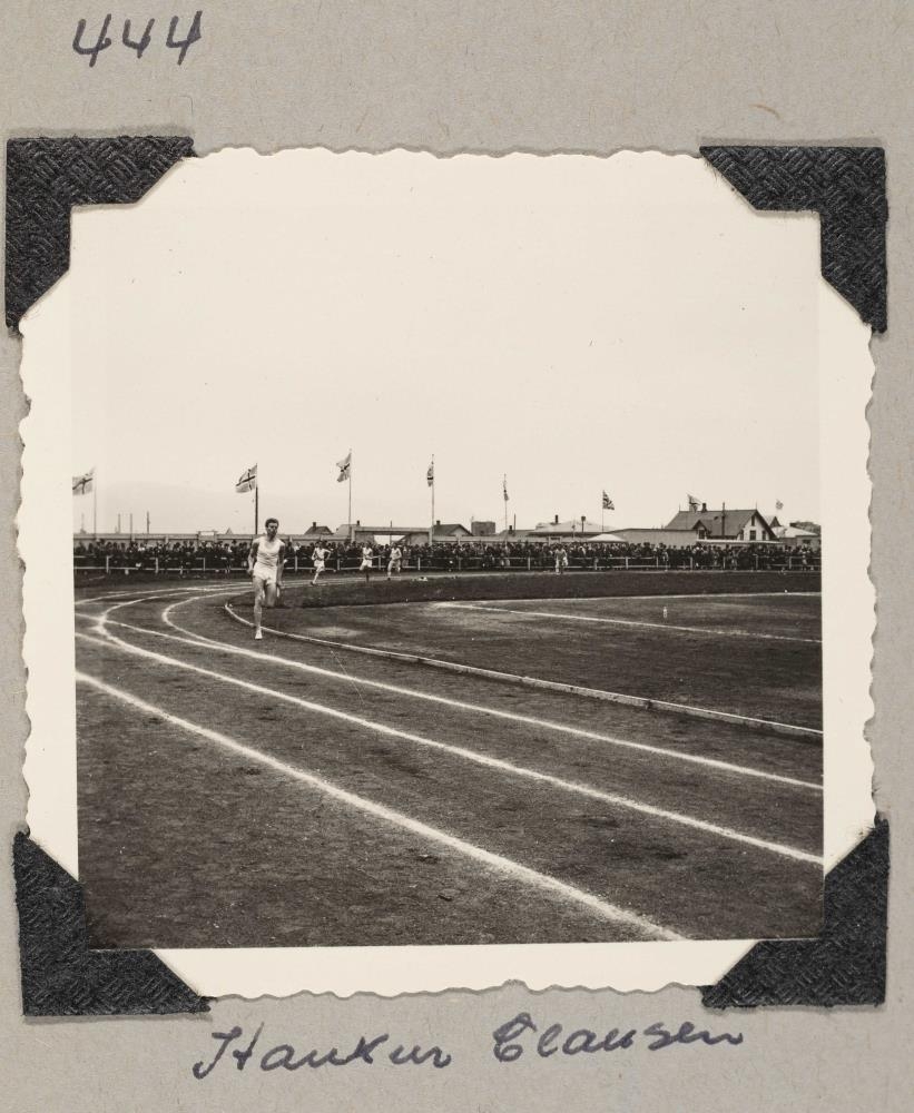 Haukur Clausen í keppni á Melavellinum. Við myndina er skrifað: 1947. Haukur Clausen.