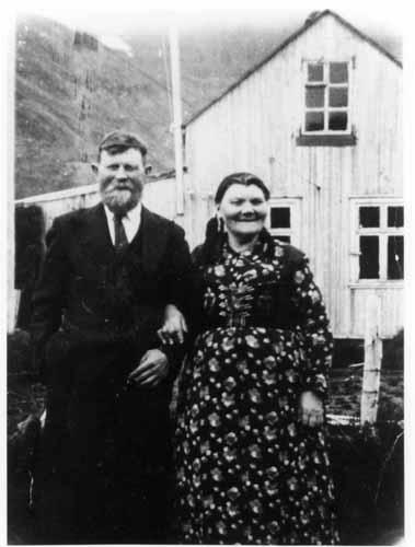 framan íbúðarhús sitt í Norðurfirði. Þau áttu 18 börn og 14 þeirra