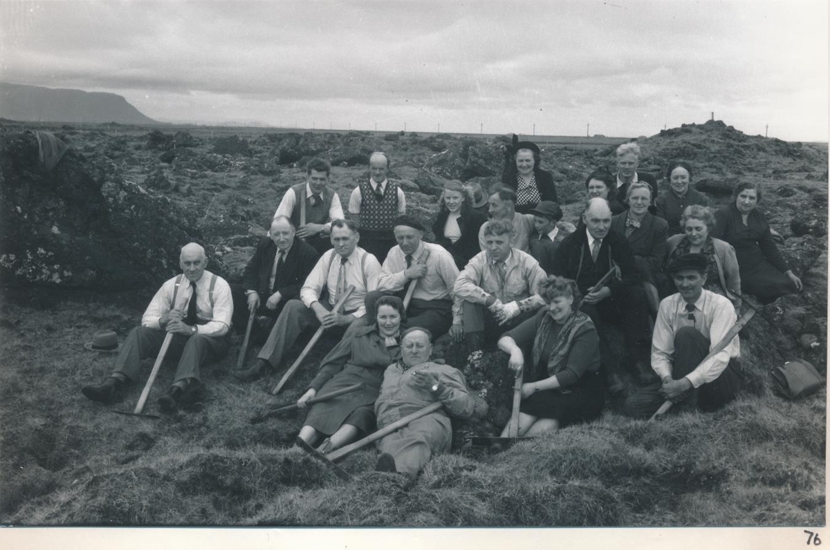 Félagar í Eyrbekkingafélaginu í 1. röð frá vinstri. Klara, Ólafur, Óþekktir. 2. röð frá vinstri: Maríus, Magnús, Andrés, Sigþór, Óþekktur og Guðmundur Sigurðss. Í þriðju röð, Geirmundur, Guðmundur Haralds, Kári, Óþekktir og Nanna.