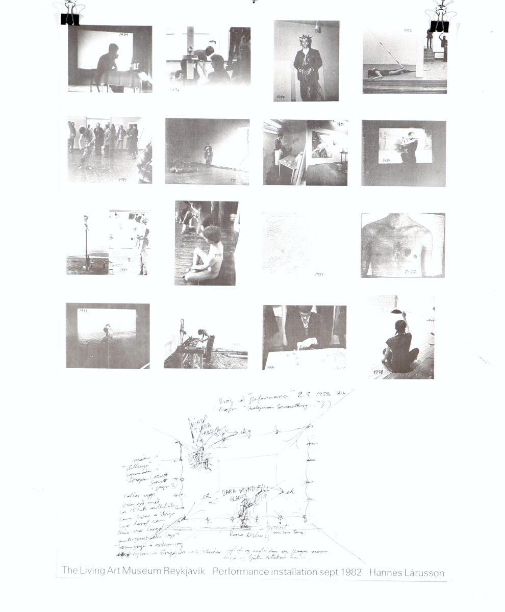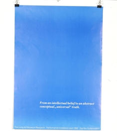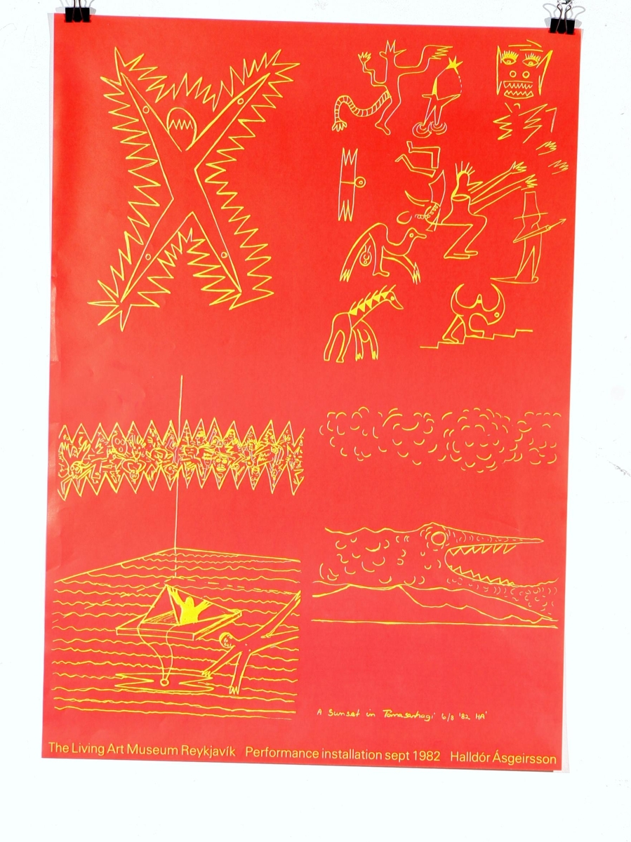 Veggspjald: vegna samsýningar, öll 4 veggspjöldin eru ólíka af bæði stræð og gerð, eitt er rautt með gulum teikningum og merkt Halldóri, annað blátt með hv/texta og er merkt Sigríði og eitt m/ mismunandi sv/hv ljósmyndum af Hannesi og er merkt honum.