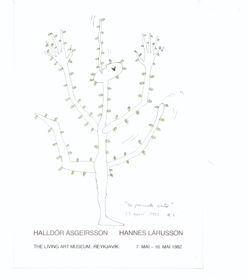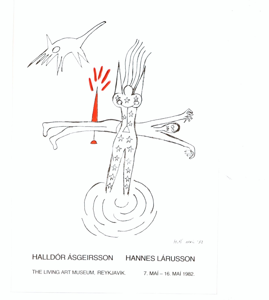Veggspjald: vegna sýningar Hannear og Halldórs 7.5.-16.5.1982, sýnir sv/hv teikningu af af ólíkum fígúrum þar sem er búið að fylla sumstaðar uppí með lit (grænum, fjólubláum. rauðum, apperlsínugulum) ásamt sýningartexta.