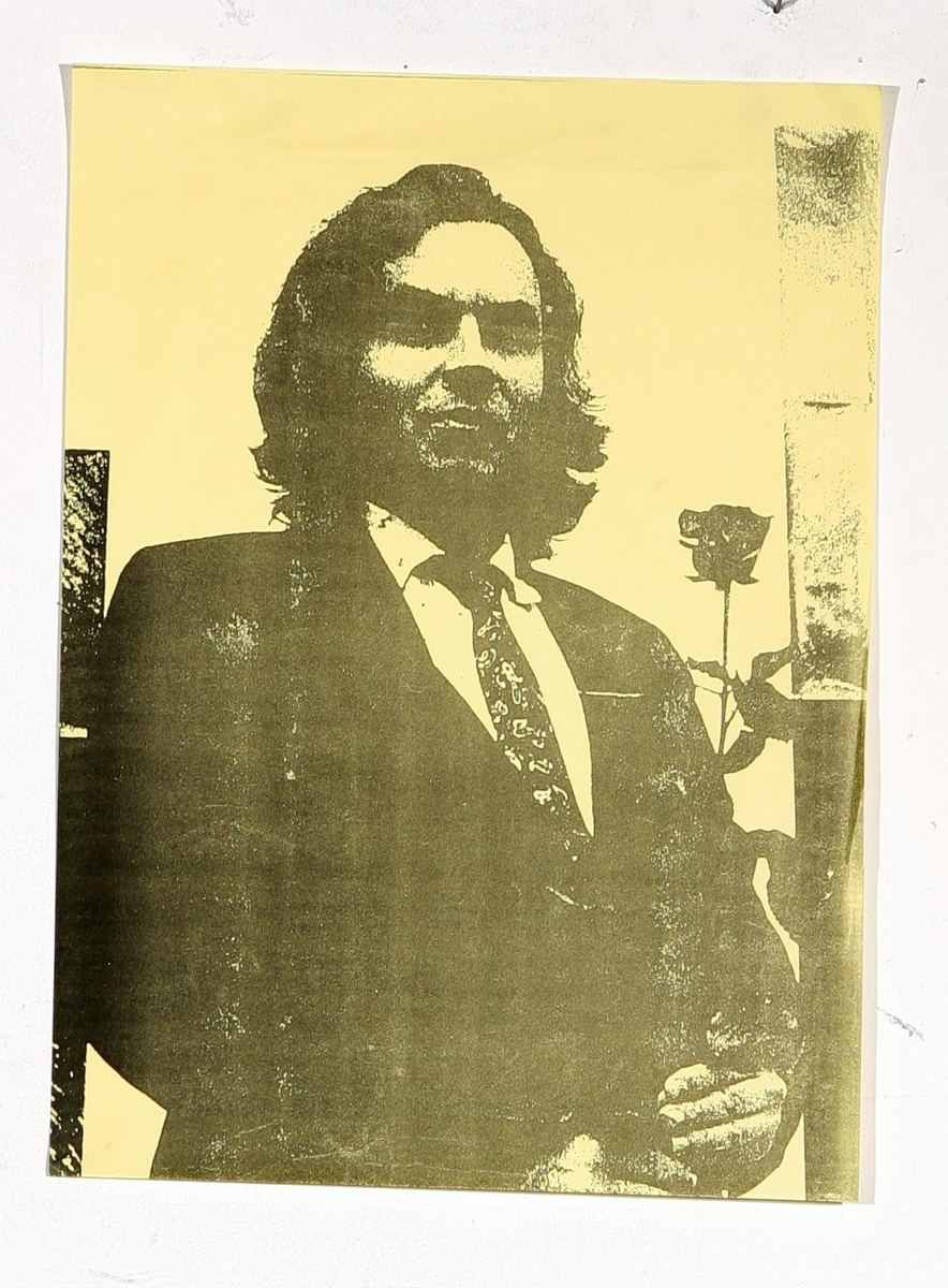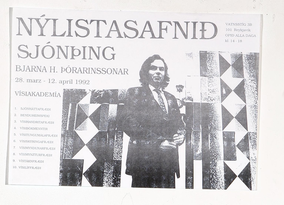 Veggspjald: vegna málþings 28.3. - 12.4.1992, sýnir sv/hv ljósmynd af Bjarna ásamt sv/kynningartexta.