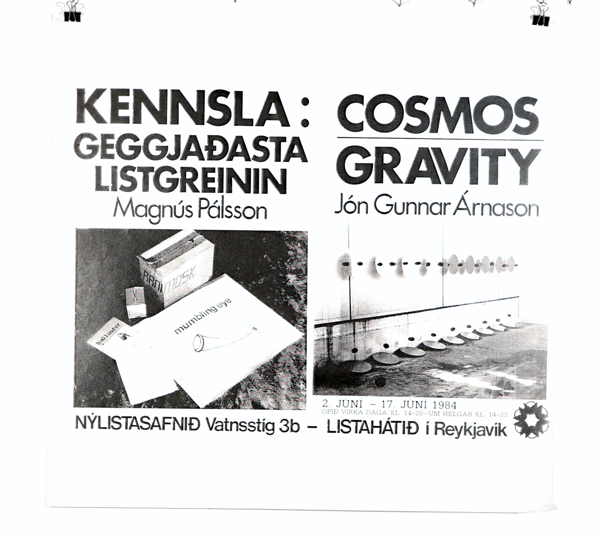 Veggspjald: vegna tveggja sýninga 2.6.-17.6.1984: tvískipt veggspjald, sýnir tvær sv/hv ljósmyndir ásamt sv/kynningartexta.