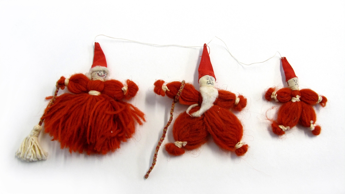 Jólaskraut, þrjár fígúrur, jólasveinar, festar saman með tvinna. Sveinarnir eru heimtilbúnir, úr rauðum lopa, með höfuð úr bómullarefni með tróði í. Húfurnar eru úr rauðu bómullarefni. Fígúrurnar eiga að vera móðir gefanda, maður hennar og frumburður. Kvenfígúran heldur á kústi sem útbúinn er úr pípuhreinsara og bómullarbandi, karlfígúrar heldur á nokkurs konar stafi úr pípuhreinsara og barnsfígúrar er minni en hinar. Þetta jólaskraut fékk móðir gefanda, Sigríður Steingrímsdóttir (f. 11.9.1927) að gjöf frá vinkonu sinni og nöfnu. Með því fylgir handskrifað bréf frá vinkonunni: