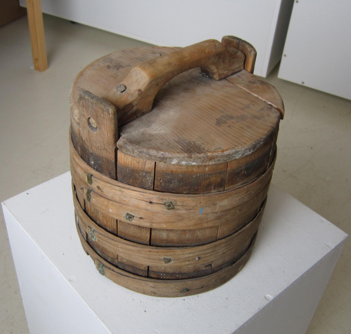 Tréfata, gömul með fjórum gjörðum og loki með handarhaldi á. Þvermál fötunnar er 24 cm og hæð 25.5 cm.