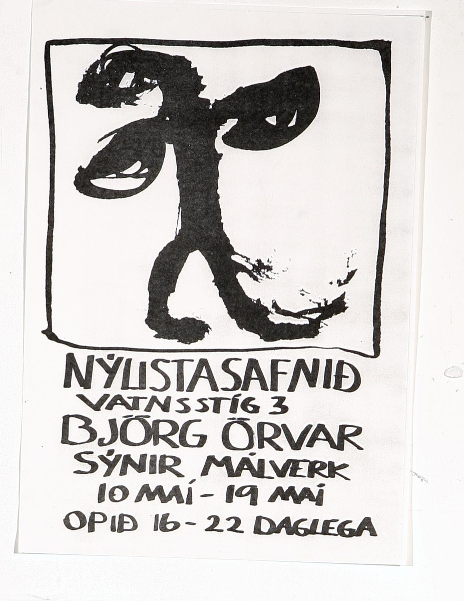 Veggspjald: vegna sýningar Bjargar 10.5.- 19.5.1985, sýnir sv/hv málaðri fígúru ásamt hanskrifuðum kynningartexta.