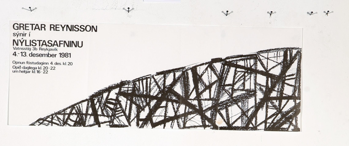Veggspjald: vegna sýningar Gretars 4.12.-13.12.1981, sýnir sv/hv grafíska kolateikningu ásamt sýningartexta.