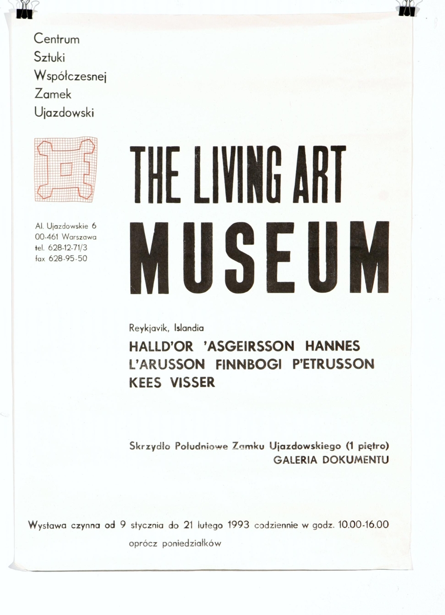 Veggspjald: vegna samsýningar í Varsjá í Pollandi 9.1.-21.2.1993, sýnir sv/kynningartexta í blokkstöfum og smá rauða mynd/lógó ofarlega til vinstri.