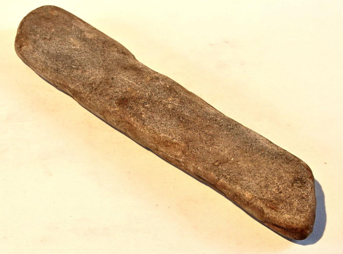 Steinbrýni. L. 18,5 cm, br. 3,5 cm. Þetta brýni var eingöngu notað til að brýna gæruhnífa, að minnsta kosti meðan Una Sigurðardóttir átti það.