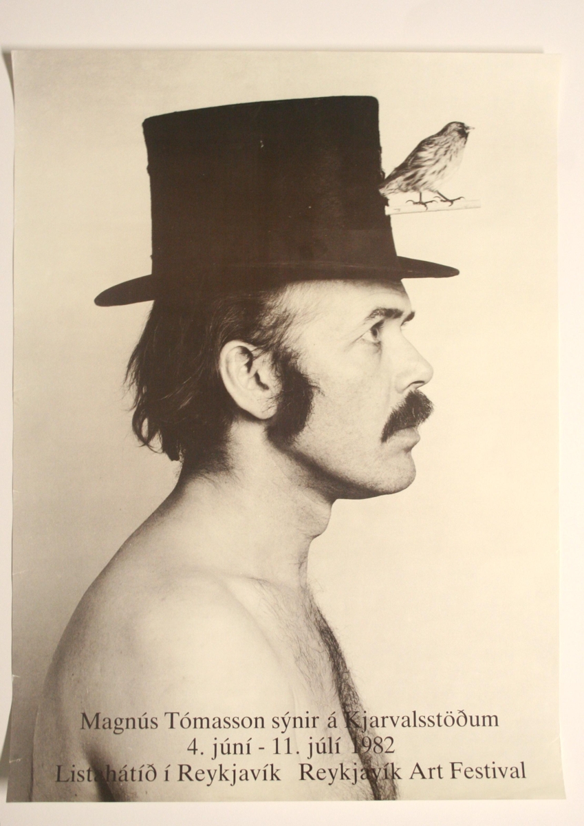 Veggspjald: vegna sýningar Magnúsar, sýnir prófílmynd af manni með hatt og fugl stingst uppúr hattinum. Ljósmynd.