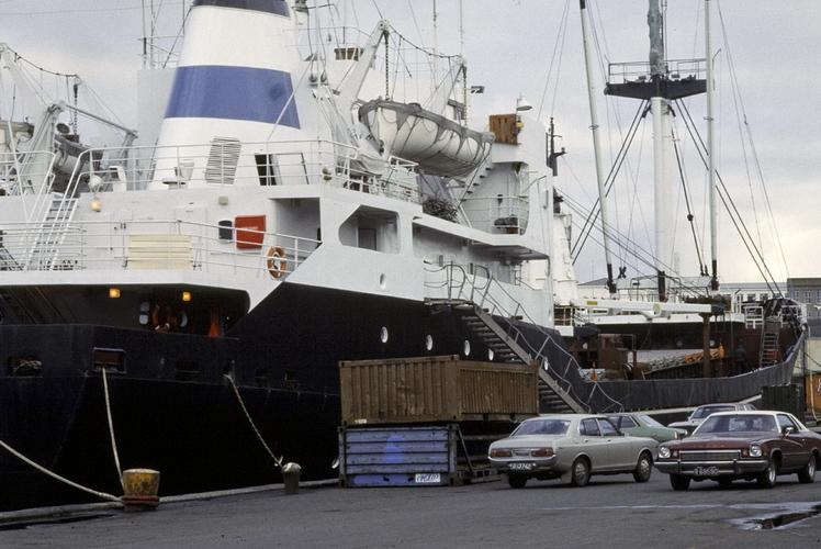 Goðafoss við bryggju. Mynd tekin á hlið, en nafn skipsins sést ekki. Þröng mynd. Ljósm: HS. haust, 1980.Tveir fólksbílar á bryggjunni, Datsun 220 ca. árgerð 1975-'76 og Buick Century 1971-'75, 2ja dyra.