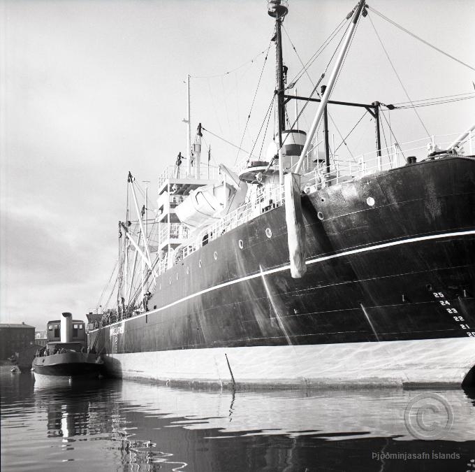 Dráttarbátur liggur utan á Flutningaskipi. Menn um borð. Sjór og hús í fjarska.