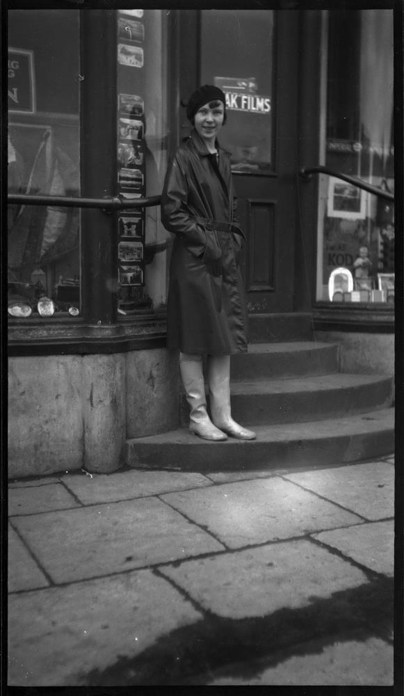 Stúlka á tröppum verslunar. Verslunargluggar