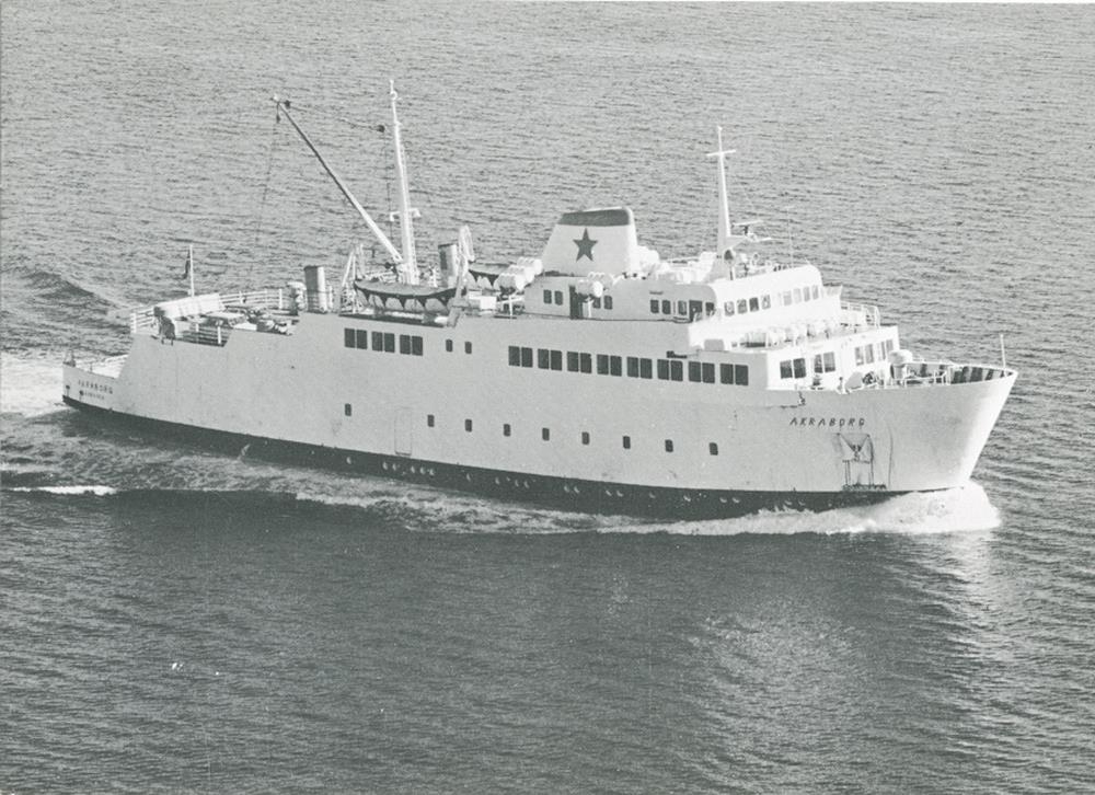 Myndefni: Hvítmáluð ferja á siglingu. Á kinnungnum er nafnið: AKRABORG.