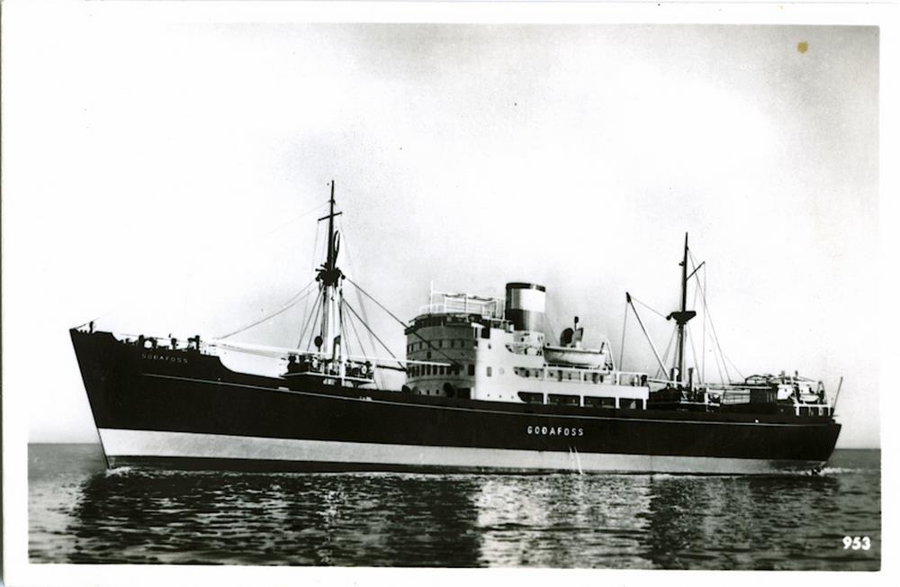 Farþega- og fraktskip á siglingu. Á hlið þess stendur: GOÐAFOSS.