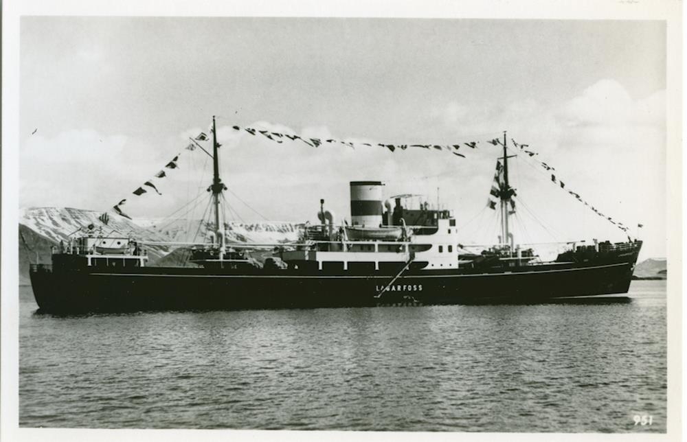 Farþega- og fraktskip á siglingu. Á hlið þess stendur: LAGARFOSS.