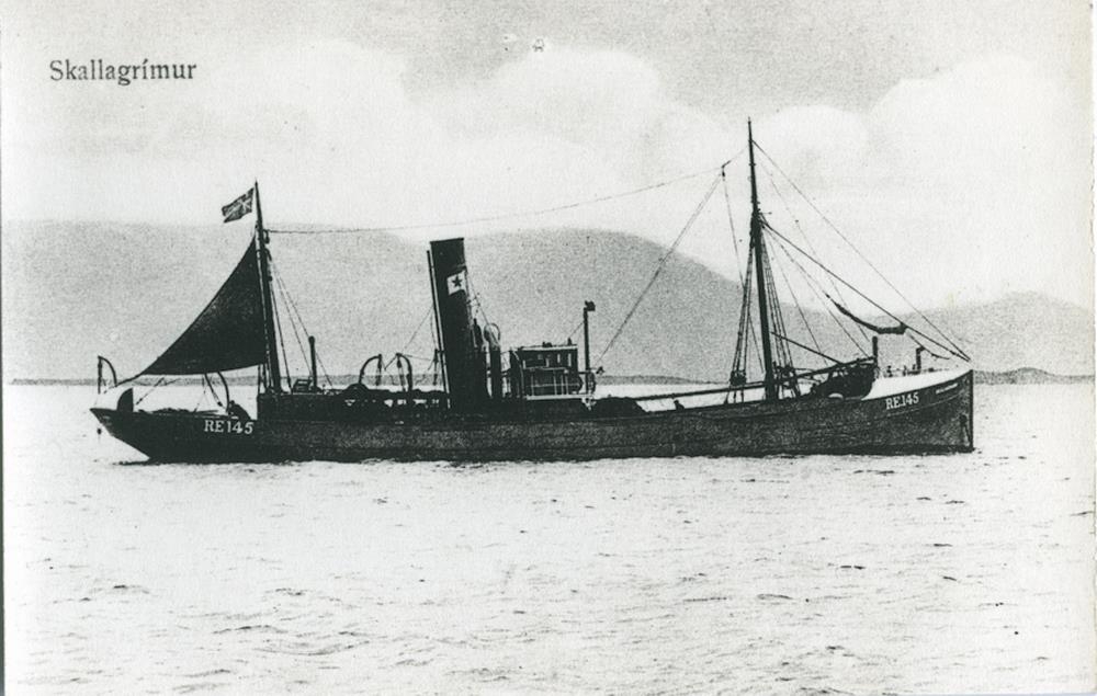 Síðutogari, gufuknúinn, á hægri siglingu. Er með messaseglið uppi og fána á sama mastri. Á kinnungnum eru stafirnir: RE 145. Fjall í bakgrunni. Efst t.v. er prentað: Skallagrímur.