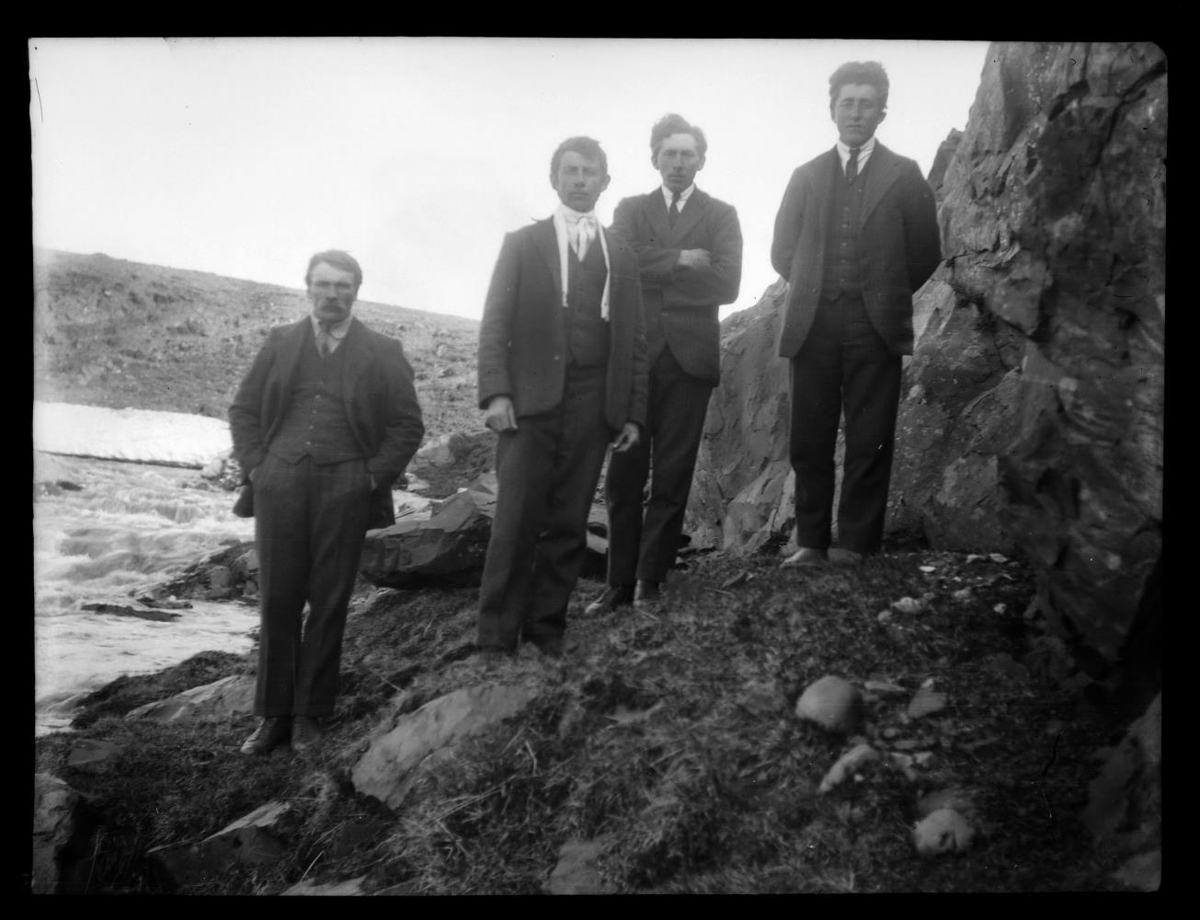 Fjórir menn standa undir kletti við á. F.v.