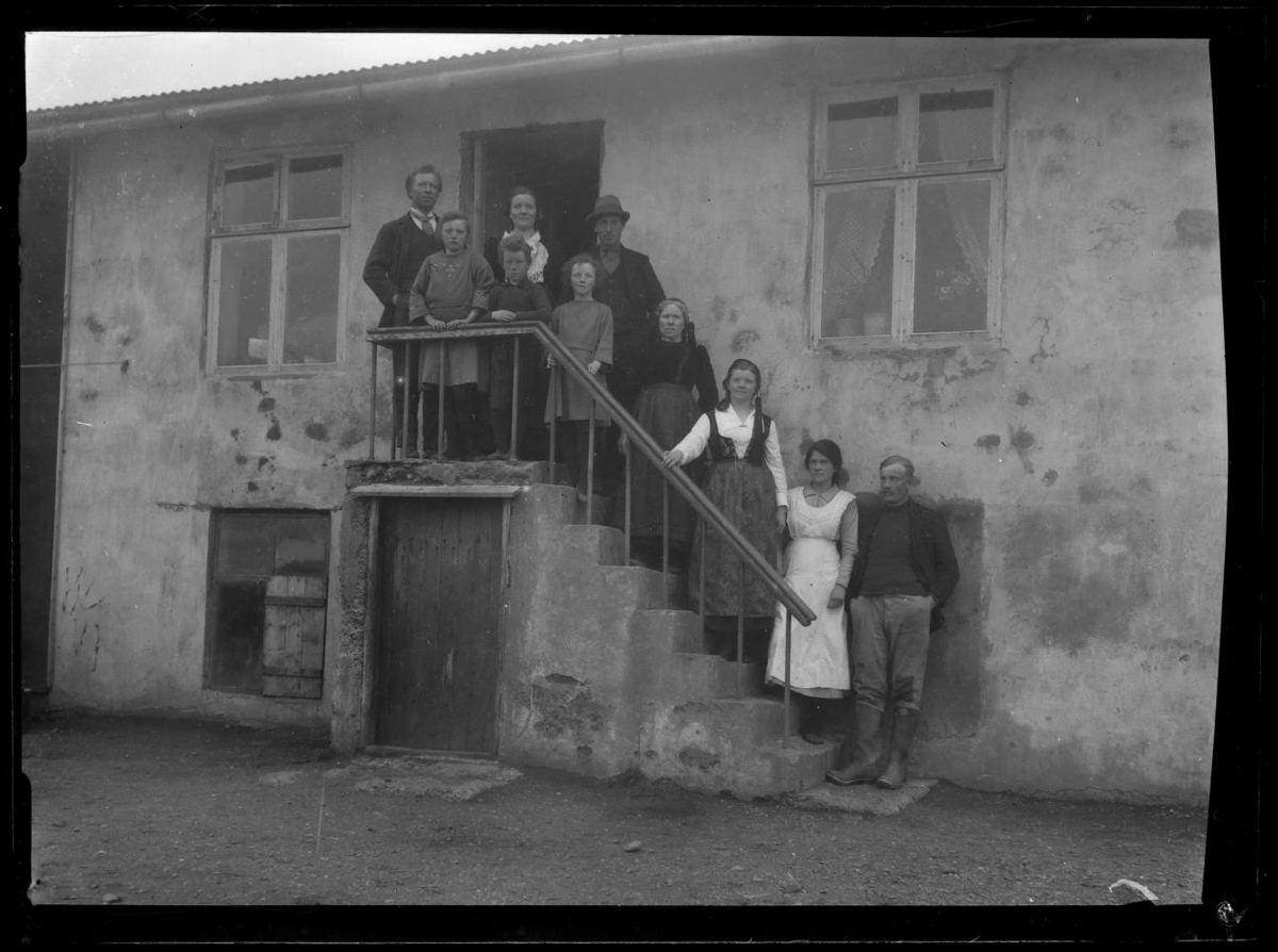 Hópur fólks á tröppum húss. Húsið er Meleyri,