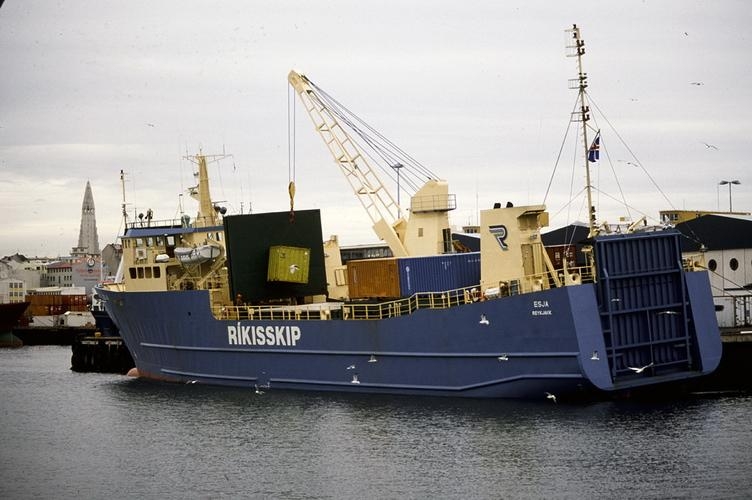 Flutningaskip. Myndir af sitt hvoru flutningaskipinu, öðru í eigu Hafskips, en hinu í eigu Ríkisskips. Víðar myndir. Strandferðaskipið Esja.