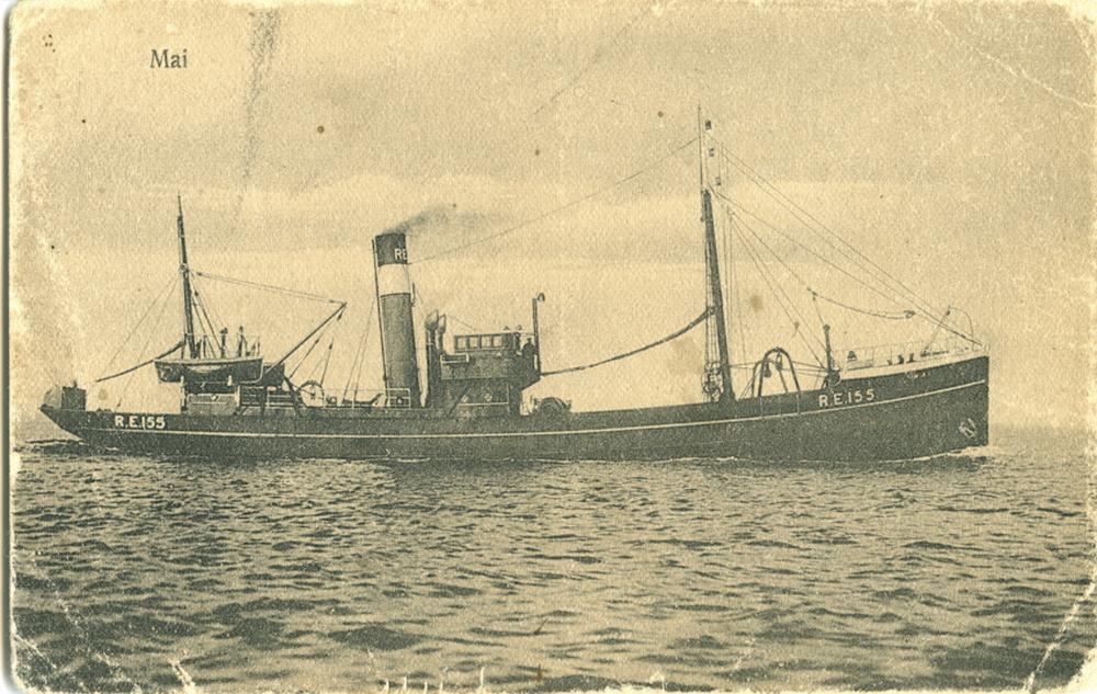 Síðutogari, gufuknúinn, á siglingu. Á kinnungnum eru stafirnir: RE 155. Efst t.v. er prentað: Maí.