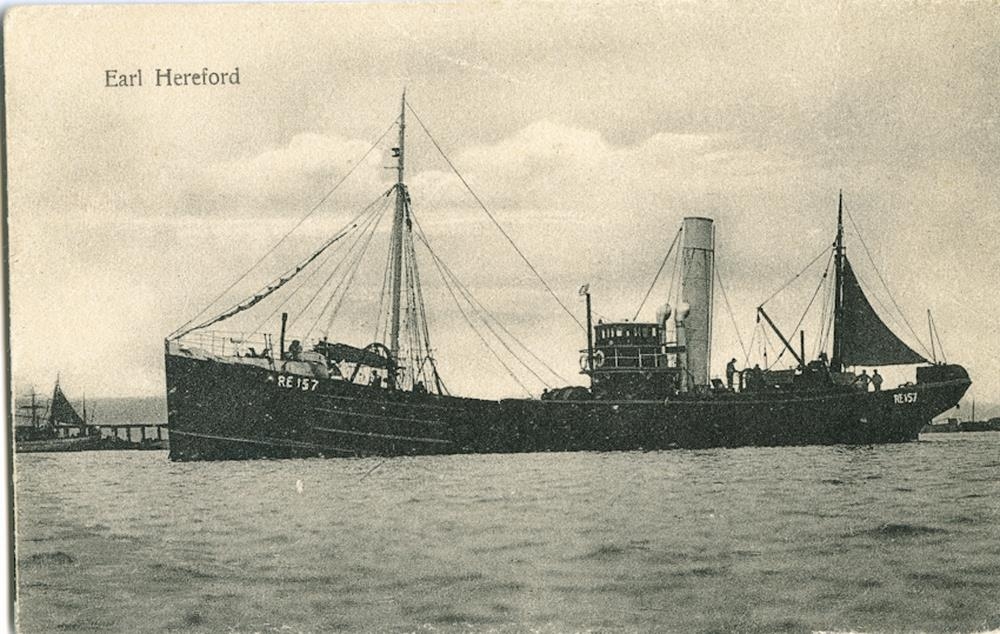 Síðutogari, gufuknúinn, á siglingu innan hafnar. Á kinnungnum eru stafirnir: RE 157. Skipið er með messaseglið uppi. Í baksýn er hafnargarður og önnur seglskip. Efst t.v. er prentað: Earl Hereford.