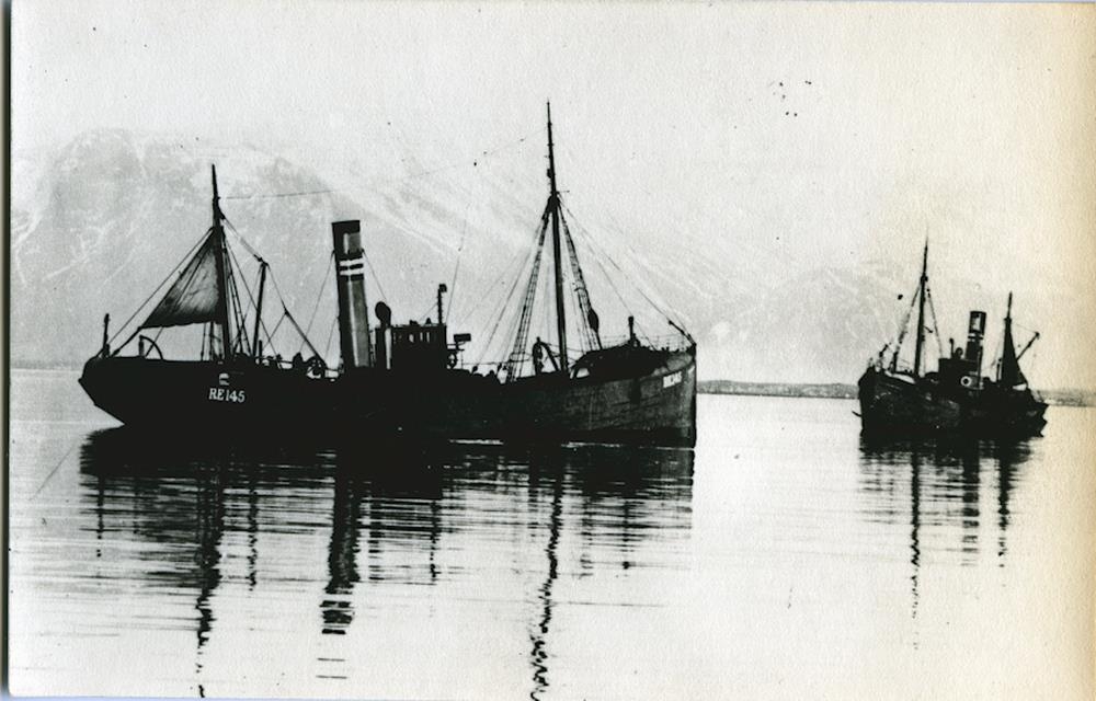 Tveir síðutogarar, gufuknúnir, lóna á spegilsléttum sjó. Á kinnung þess sem nær er eru stafirnir: RE 145. Í baksýn er lágt eiði og fjall.
