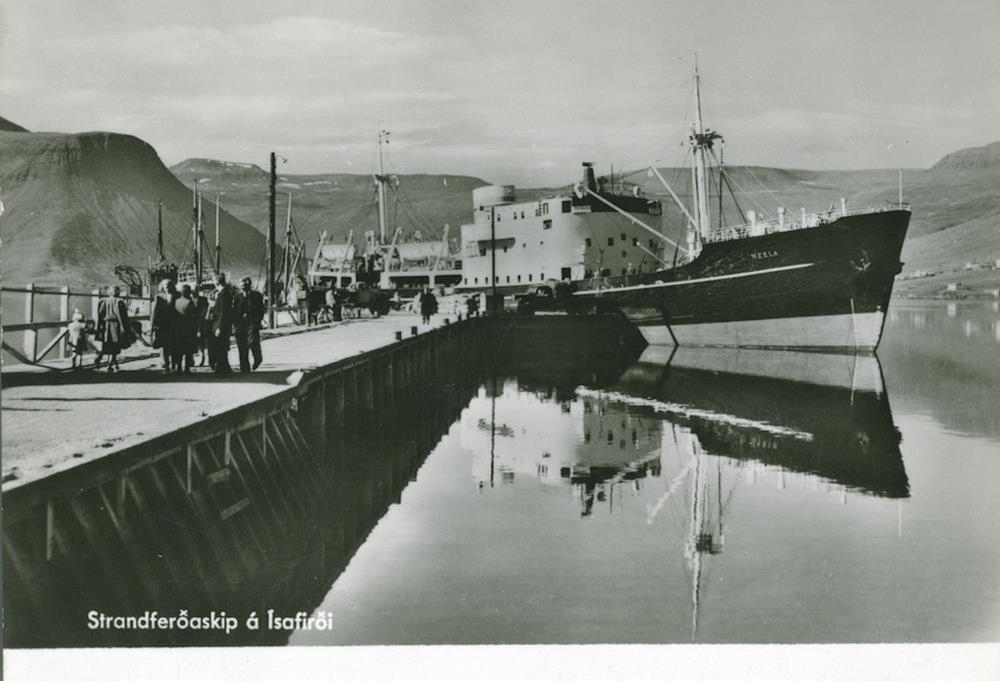 Farþega- og flutningaskip liggur við endann á bryggju sem gengur út á vík frá vinstri í myndinni. Fólk á gangi á bryggjunni og vörubílar fremst. Há fjöll í baksýn. Neðst t.v. er prentað: Strandferðaskip á Ísafirði.