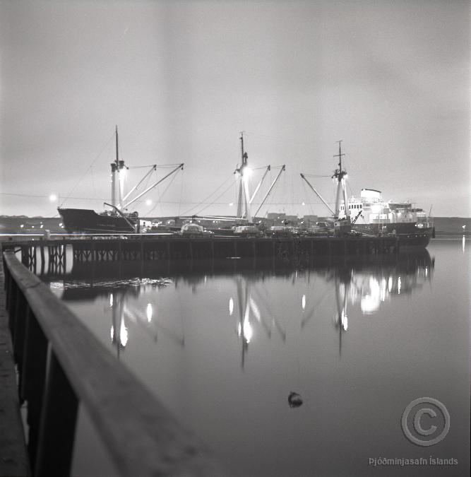 Hafnarfjörður. Raflýsing á götum (27. nóv. 1954) Gömul hús (28. nóv. 1954). Sjór, bryggja, skip. Á bryggjunni eru bílar og krani.