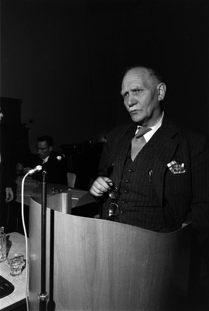 Aðalfundur Mjólkurbús Flóamanna að Flúðum þann 12. apríl 1960. Egill Thorarensen kaupfélagsstjóri í ræðustól.